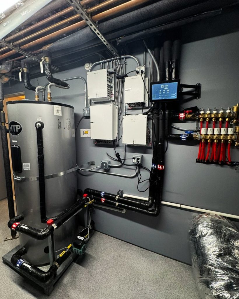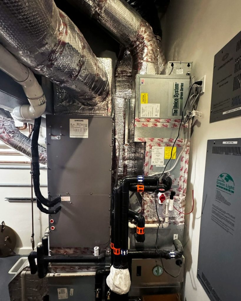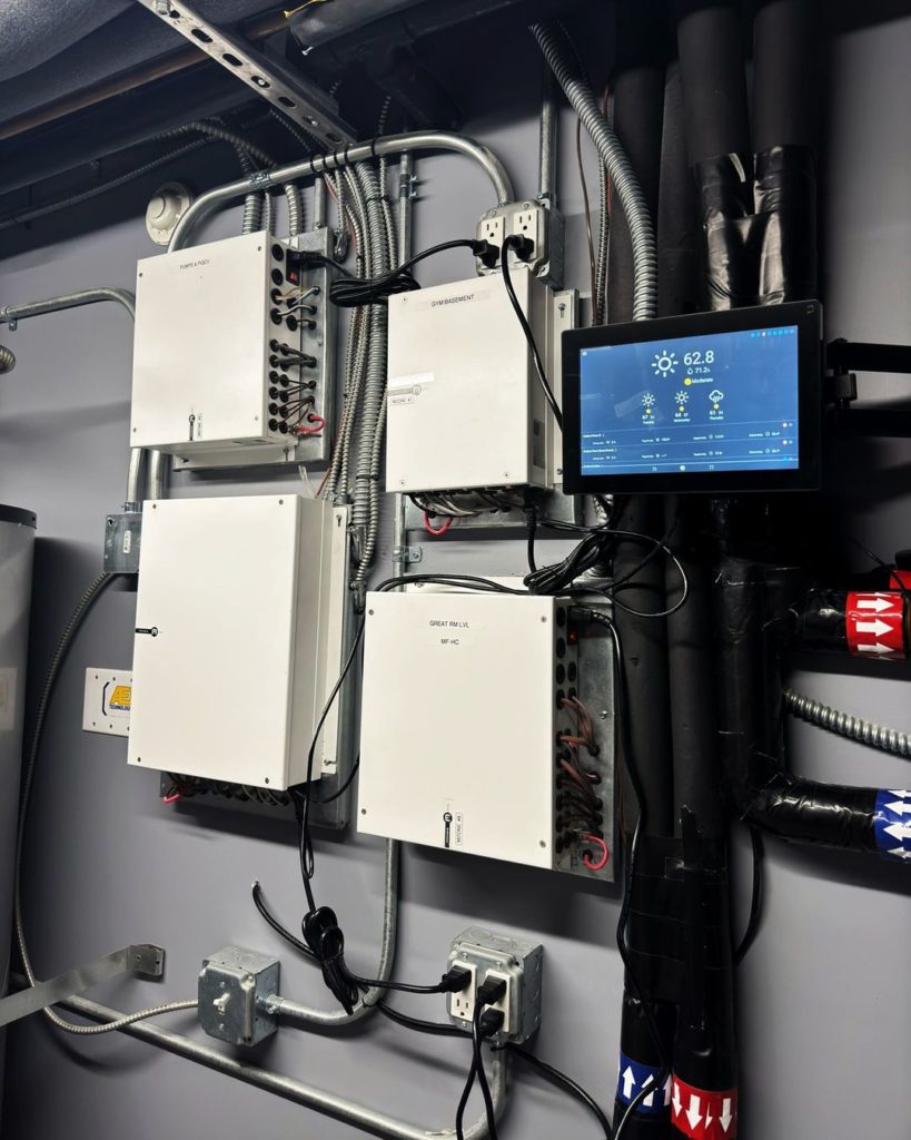 For heating, the hydronic system utilizes two HTP boilers, one for a high-temperature radiant floor system, and another for a low-temperature radiant ceiling system. For cooling, a Samsung chiller provides chilled water for the radiant ceiling and hydronic fan coils. Additionally, a Samsung heat pump provides chilled water for cooling in the AV equipment room.
